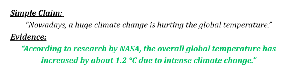Look for the claims and arguments that you made in the essay, and support each argument with a relevant example or evidence. Evidence could be a fact, an expert’s opinion, or a statistic.