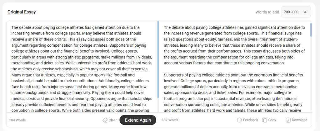 If you are still stuck on increasing the word count of your essay due to writer’s block, lack of ideas, or deadline pressure, here is a pro tip. You can get help from an online essay expander tool. These tools are trained on a vast dataset and are efficient in instantly expanding any type of essay.